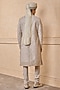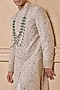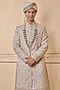 Featuring an ivory sherwani in cotton base with embroidery. It is paired with churidar. Style it with a pair of mojaris, safa and malas for a wedding or engagement ceremony.