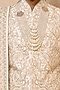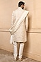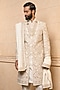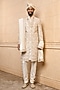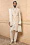 Featuring an ivory sherwani in raw silk base with embroidery. It is paired with a kurta, pants and a stole. Accentuate it with pair of mojaris, a safa and a mala for a traditional look, Perfect wear for your wedding or engagement ceremony.