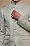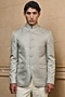 Featuring a light grey bandhgala in jacquard and polyester base with embroidery and a structured silhouette. It is paired with pants. Style it with pair of loafers and a bracelet for festive celebrations or wedding ceremony.