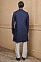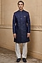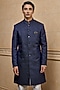 Featuring a navy indowestern in polyester base. It is paired with a kurta and trousers. Style it with pair of loafers and a bracelet for a wedding or sangeet ceremony.