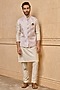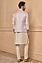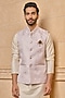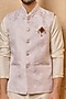 Featuring a pink bundi jacket in metallic and polyester base with brocade detailing. It is paired with a kurta and pants. Style it with a heritage brooch and regal safa, perfect for weddings or an engagement ceremony, rooted in tradition and elegance.