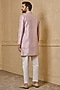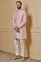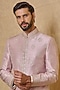 Featuring a pink achkan jacket in raw silk base with geometric embroidery. It is paired with pants. Ideal attire for a festive occasion or pre-wedding ceremonies.