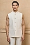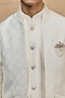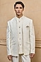 Featuring a white bandhgala in jacquard and polyester base with a structured silhouette. It is paired with an inner jacket and pants. Style it with pair of loafers and a bracelet for festive celebrations or wedding ceremony.