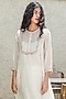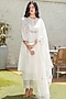 Featuring a white kurta in chanderi base with multi-colored resham, sequins, kantha and zari embroidery. It is paired with matching pants and a slip.