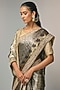 Featuring a black saree in banarasi tissue base. It is paired with an unstitched blouse. Accentuate it with polki jewellery and block heels for festive occasions or pooja ceremony.