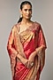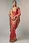 Featuring a deep pink saree in kanjivaram base. It is paired with an unstitched blouse. Accentuate it with polki jewellery and block heels for festive occasions or pooja ceremony.