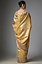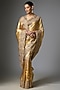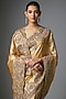 Featuring a gold saree in kanjivaram base. It is paired with an unstitched blouse. Accentuate it with polki jewellery and block heels for a festive look, sangeet or wedding ceremonies.