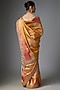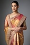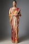 Featuring a gold saree in kanjivaram base. It is paired with an unstitched blouse. Accentuate it with polki jewellery and block heels for a festive look, sangeet or wedding ceremonies.
