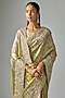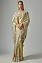 Featuring a gold saree in kanjeevaram silk base. It is paired with an unstitched blouse piece. Style it with statement gold jewellery, sleek heels, and a neat bun for weddings, receptions, festive celebrations, and elegant evening occasions.
