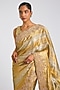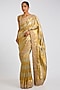 Featuring a gold-silver saree in kanjivaram base. It is paired with an unstitched blouse fabric. Accentuate it with kundan or meenakari jewellery, a sleek floral hairdo and block heels for a reception, wedding, sangeet or engagement ceremony.