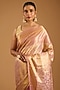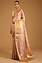 Featuring a lavender saree in kanjivaram base. It is paired with an unstitched blouse fabric. Style this designer saree with a blouse, kundan polki, jewellery and gajras perfect for festive occasion, wedding or engagement ceremony.