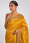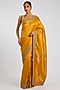 Featuring a mustard saree in kanjivaram base. It is paired with an unstitched blouse fabric. Accentuate it with kundan or meenakari jewellery, a sleek floral hairdo and block heels for a haldi, wedding, sangeet or engagement ceremony.