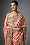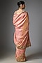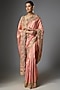 Featuring a peach saree in kanjivaram base. It is paired with an unstitched blouse. Accentuate it with polki jewellery and block heels for a festive look, engagement or wedding ceremonies.