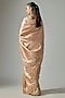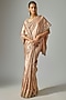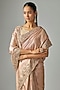 Featuring a peach saree in kanjeevaram silk base with a running blouse. Style it with statement gold jewellery, sleek heels, and a neat bun for weddings, receptions, festive celebrations, and elegant evening occasions.