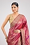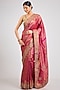 Featuring a pink saree in kanjeevaram silk base. It is paired with an unstitched blouse piece. Style it with statement gold jewellery, sleek heels, and a neat bun for weddings, receptions, festive celebrations, and elegant evening occasions.