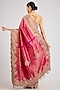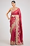 Featuring a pink saree in kanjeevaram silk base with an attached blouse piece. Style it with statement gold jewellery, sleek heels, and a neat bun for weddings, receptions, festive celebrations, and elegant evening occasions.