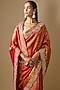 Featuring a pink saree in kanjivaram base. It is paired with an unstitched blouse. Style it with statement jewellery, potli and heels for a festive occasion, reception, wedding or engagement ceremony.