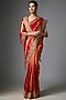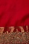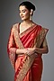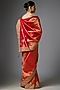 Featuring a red saree in kanjivaram base. It is paired with an unstitched blouse. Accentuate it with polki jewellery and block heels for a festive look, engagement or wedding ceremonies.