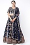 Featuring a dark navy blue bridal lehenga in velvet base with zardosi embroidery. It is paired with a matching blouse and a dupatta.