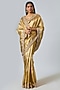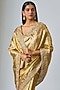 Featuring a gold kanjivaram saree in silk base with zardosi work. It is paired with an unstitched blouse. Accentuate it with statement earrings and block heels for a graceful look, perfect for festive gatherings or weddings.