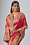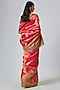 Featuring a red and rani pink kanjivaram saree in silk base with zardosi work. It is paired with an unstitched blouse. Accentuate it with statement earrings, a potli bag and block heels, perfect for a bridal look or weddings.