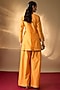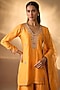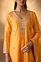 Featuring a mango yellow short kurta in handwoven chanderi base with zardosi embroidery and scattered floral motifs. It is paired with wide kali pants and an organza dupatta. Accentuate it with heavy jewellery, embellished heels and a potli bag, Perfect wear for wedding ceremony or festive occasions.