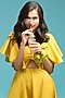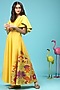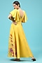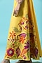 Featuring a yellow gown in cotton base with lime green detail, fluttered sleeves, multi-colored applique embellishment, and a pleated bodice.