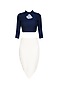 This set features a navy blue collared crop top in cotton satin base with bow detailing on the neck paired with white petal hem georgette skirt.