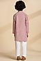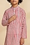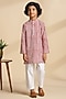 Featuring a maroon kurta for boys in cotton base with striped handblock print. It is paired with printed pants. Style it with a watch and pair of mojris for a wedding, sangeet or engagement ceremony.