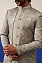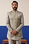 Featuring a beige embossed indowestern in jacquard base with floral print. It is paired with a kurta and pants. Perfect for a wedding, sangeet or engagement ceremony, exuding charm and elegance.