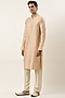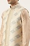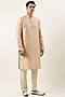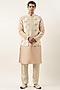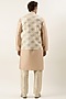 Featuring a beige jacket in raw silk base with embroidery. It is paired with a kurta and pants. Style it with mojaris for a festive occasion, sangeet, engagement or wedding ceremony.