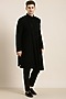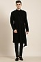 Featuring a black draped indowestern in art silk base with embroidery. It is paired with pants. Style it with mojaris for a sangeet or wedding ceremony.