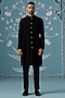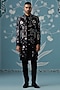 Featuring a black open indowestern in cotton silk base with floral embroidery. It is paired with a kurta and pants. Style it with mojaris for a reception, wedding, sangeet or engagement ceremony.