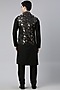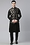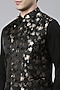 Featuring a black bundi jacket in jacquard art silk base with golden floral motif print. It is paired with a matching kurta and churidar pants.