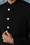 Featuring a black bandhgala in polyester base. It is paired with pants. Style it with loafers for a reception, wedding, sangeet or engagement ceremony.