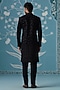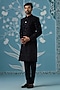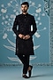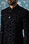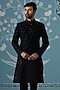 Featuring a black sherwani in velvet base with hand embroidery. It is paired with pants. Style it with mojaris for a wedding, sangeet or engagement ceremony.