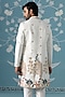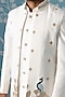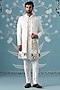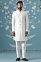 Featuring a cream long bundi jacket in poly cotton base with embroidery. It is paired with a kurta and pyjama pants. Style it with shoes for a festive occasion, wedding, engagement or sangeet wear.