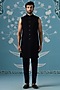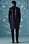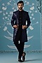 Featuring a dark blue jacket in imported fabric base. It is paired with a kurta and pants. Style it with mojaris for a reception, wedding, engagement or sangeet ceremony.