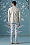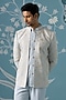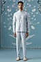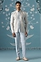 Featuring a dusky blue open-indowestern in cotton silk base with embroidery. It is paired with a kurta and pants. Style it with mojaris for a reception, wedding, sangeet or engagement ceremony.