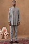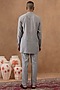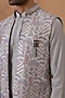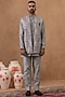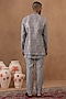 Featuring a grey indowestern jacket in poly cotton base with embroidery. It is paired with a kurta and pyjama pants. Style it with mojaris for a festive occasion, wedding, engagement or sangeet ceremony.