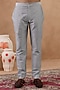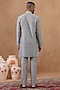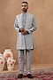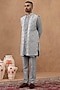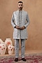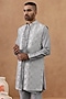 Featuring a grey long bundi jacket in satin base with thread embroidery. It is paired with a kurta and pyjama pants. Style it with mojaris for a festive occasion, cultural event, sangeet, wedding or engagement ceremony.