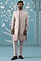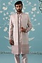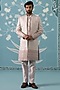 Featuring a light onion pink indowestern jacket in poly cotton base with embroidery. It is paired with a kurta and pants. Style it with mojaris for a wedding, engagement or sangeet ceremony.