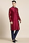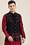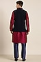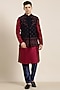 Featuring a navy blue bundi jacket in wool base with pashmina embroidery. It is paired with a contrasting maroon kurta and pants. Perfect for a wedding or engagement ceremony.