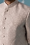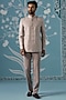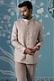 Featuring a pastel onion pink bandhgala in cotton blend base with print. It is paired with pants. Style it with mojaris for a festive occasion, wedding, engagement or sangeet ceremony.