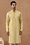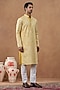 Featuring a yellow kurta in cotton silk base with embroidery. It is paired with pyjama pants. Style it with mojaris for a festive occasion, cultural event, haldi, wedding or engagement ceremony.