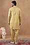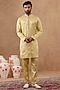 Featuring a yellow long bundi jacket in crepe base with embroidery. It is paired with a kurta and pyjama pants. Style it with shoes for a festive occasion, wedding, engagement or haldi wear.