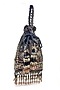 Featuring a charcoal rectangular bag in cotton dupion base with thread, shell, tassels, and beads embroidery. It has a wrist straps and drawstrings.
