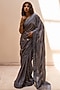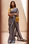Featuring a grey saree in chinon base with gota patti embroidery. It is paired with a contrasting yellow blouse in jaam cotton silk base and a potli bag.