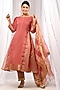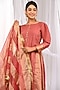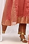 Featuring a peach kali kurta in soft chanderi, woven banarasi and cotton silk base with sequins buttons, striped zari print and zari embroidery. It is paired with matching pants and a dupatta.
