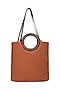 Featuring a rust colored tote bag in soft jute and faux leather base with adjustable sling handle, magnetic button closure including interior mobile and zipped pocket. It has a polydrill underlining and metal hardware.